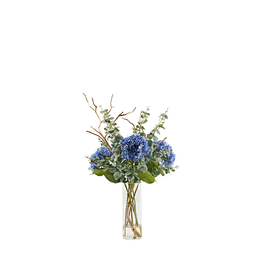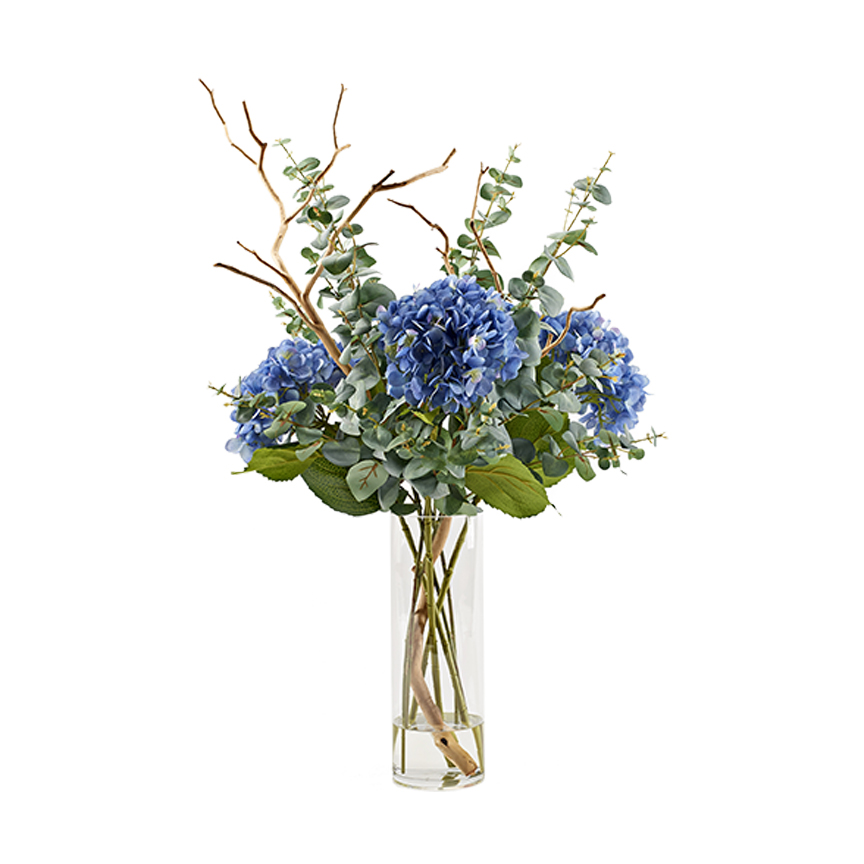 Blue Hydrangeas, Eucalyptus & Sandblasted Dragonwood in Fleur Vase – 229041