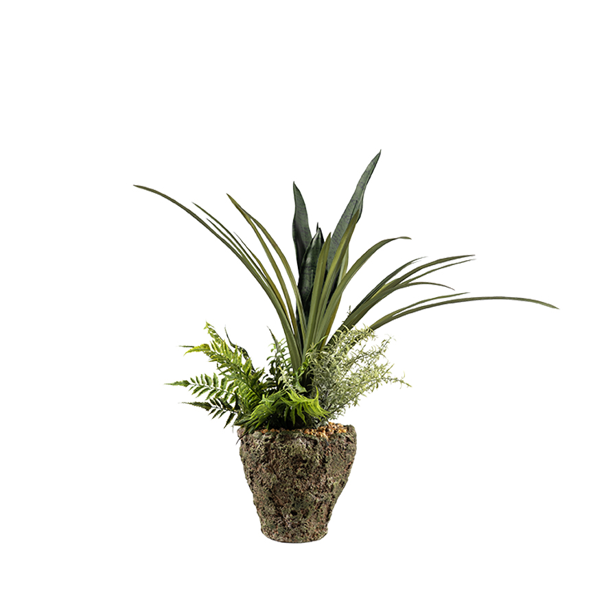 Dark Green Sansevieria, Areca Grass, Leather Fern & Rosemary in Ancient Grove Pot – 264008
