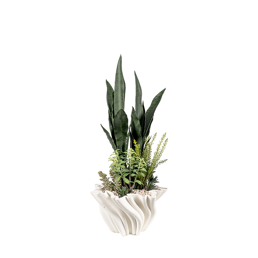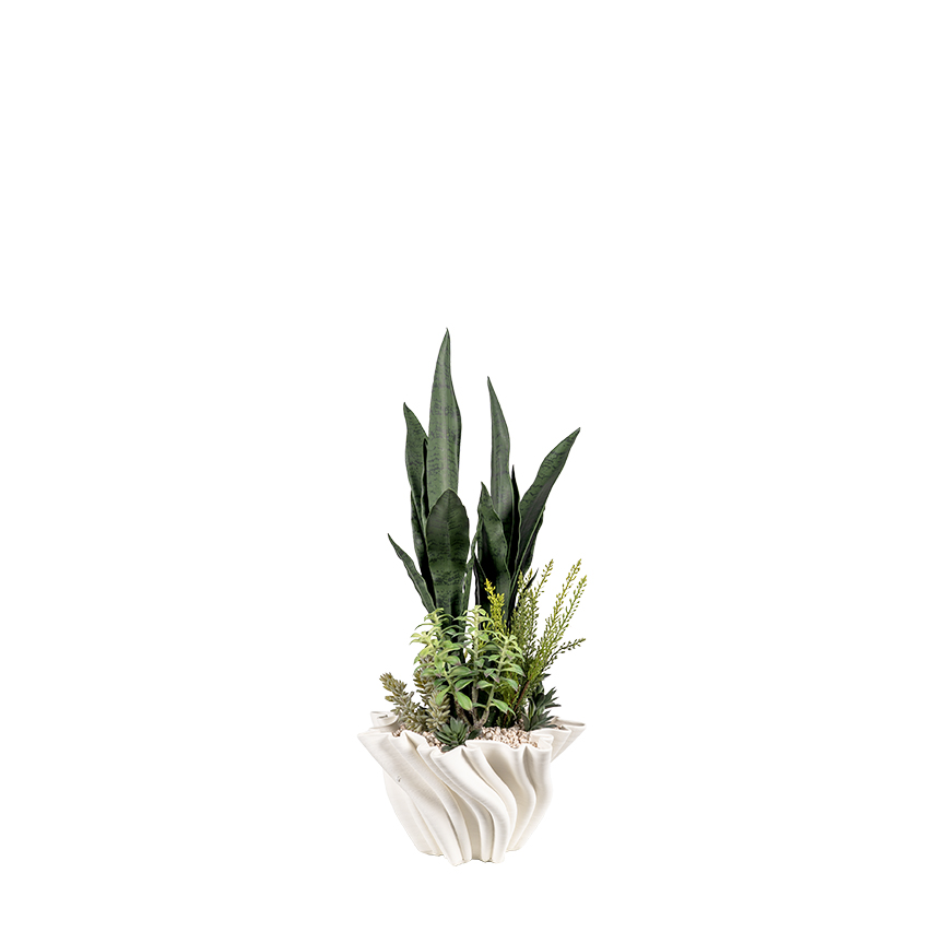 Dark Green Sansevieria, Heather Fern Bush & Assorted Succulents in Spiral Bloom Pot – 264017